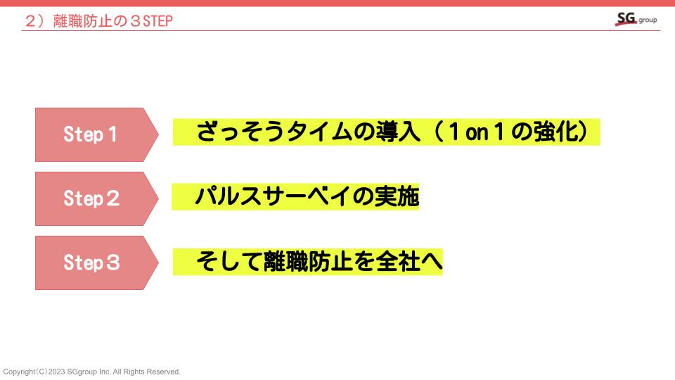 パルスサーベイ実施後は、①推移の確認→②設問別確認→③個別確認の3ステップで結果分析を行い、必要に応じて面談を実施しています。