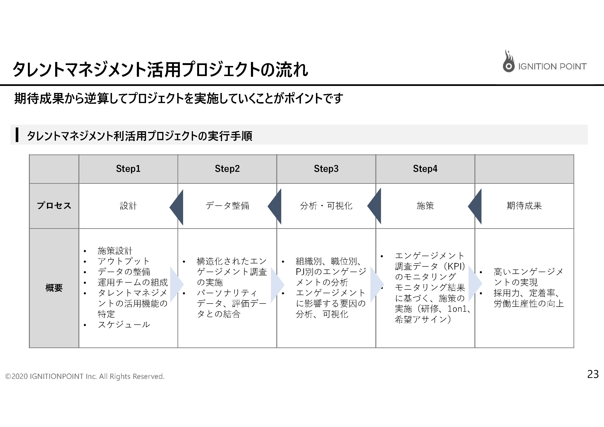 タレントマネジメントは、「まず溜めればなんとかなるだろう」ではなく、「こういう結果を得たい」といったゴールから逆算して考えることが大事なポイントです。