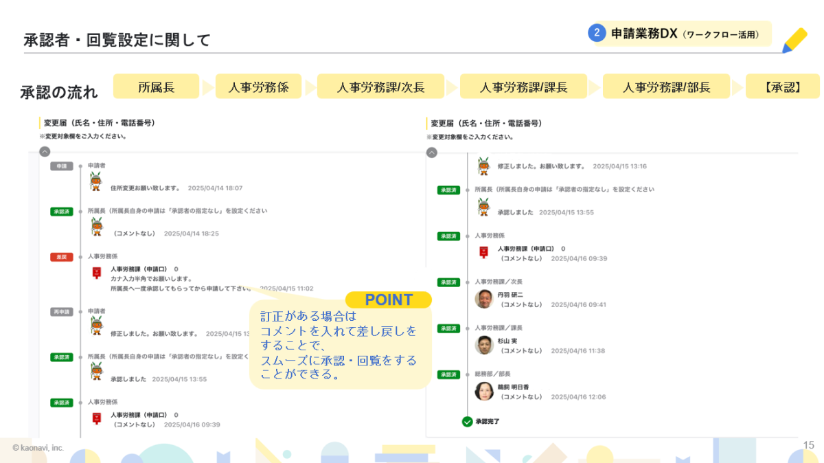 入力内容に間違いがあった場合、コメントを残して差し戻すことで、申請者はどこに不備があったかすぐにわかります。そのため、その後の修正や再申請もスムーズです。